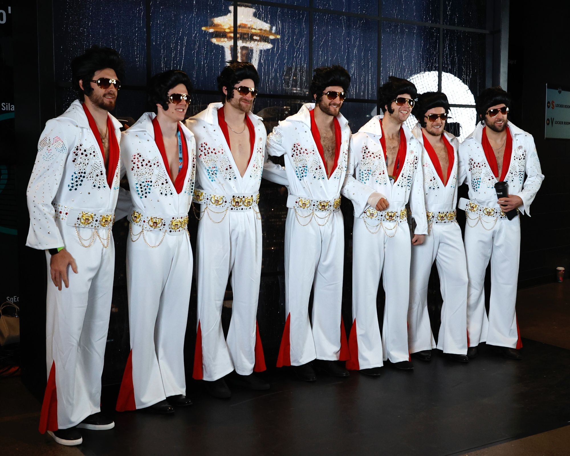 Хоккеисты «Вегаса» переоделись в костюмы Элвиса Пресли, дополнив образ очками и париками. Певец долгое время жил в Лас-Вегасе и стал одним из символов города.